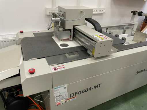 Ploter 0604 MT to zautomatyzowane urządzenie wyposażone w głowicę bigującą z serwomechanizmem, nóż aktywny służący do wycinania materiałów o grubości do 6 mm, nóż wleczony sprawdzający się idealnie przy nacinaniu papieru/folii samoprzylepnej oraz cięciu materiału do grubości 2 mm jak również pisak. Opcjonalnie ploter może być wyposażony w głowicę z nożem oscylacyjnym pozwalając na cięcie materiału o grubości do 10 mm jak również nóż V-cut służący do wycinania w tekturze litej rowka w kształcie litery „V” np. pod prototypowanie pudełek. Możliwe jest również zastosowanie noża rotacyjnego do cięcia tekstyliów. W wyposażeniu standardowym urządzenia znajduje się również odwijacz, który umożliwia cięcie materiału z roli. Prędkość przejazdu głowicy wynosi do 1500 mm/s, dokładność do 0,01 mm, a solidna metalowa konstrukcja sprawia, że stabilność i dokładność pracy plotera Sinajet nie ustępuje ploterom renomowanych światowych firm. Materiał w arkuszach podawany jest za pomocą ssawek, a sam stół roboczy również wyposażony jest w podsys materiału.