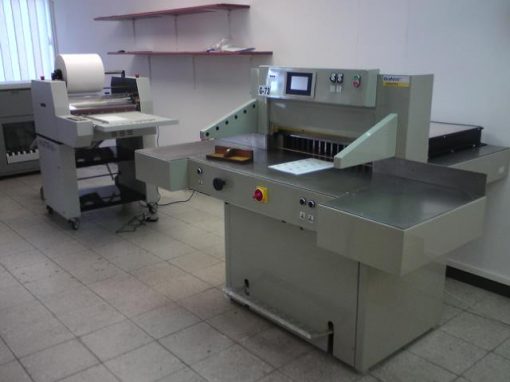Pierwsze z nich to krajarka Grafmasz 73cm wyposażona dodatkowo w żebrowaną belkę dociskową umożliwiające cięcie z minimalną resztką 20mm.gilotyna posiada również programator dotykowy, fotokomórki i boczne stoły pokryte stalą nierdzewną.