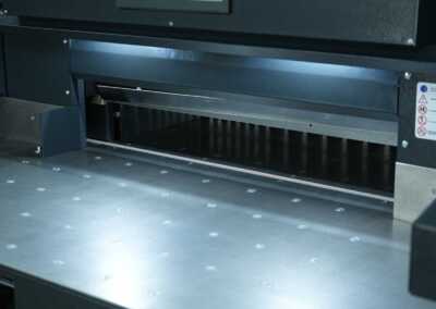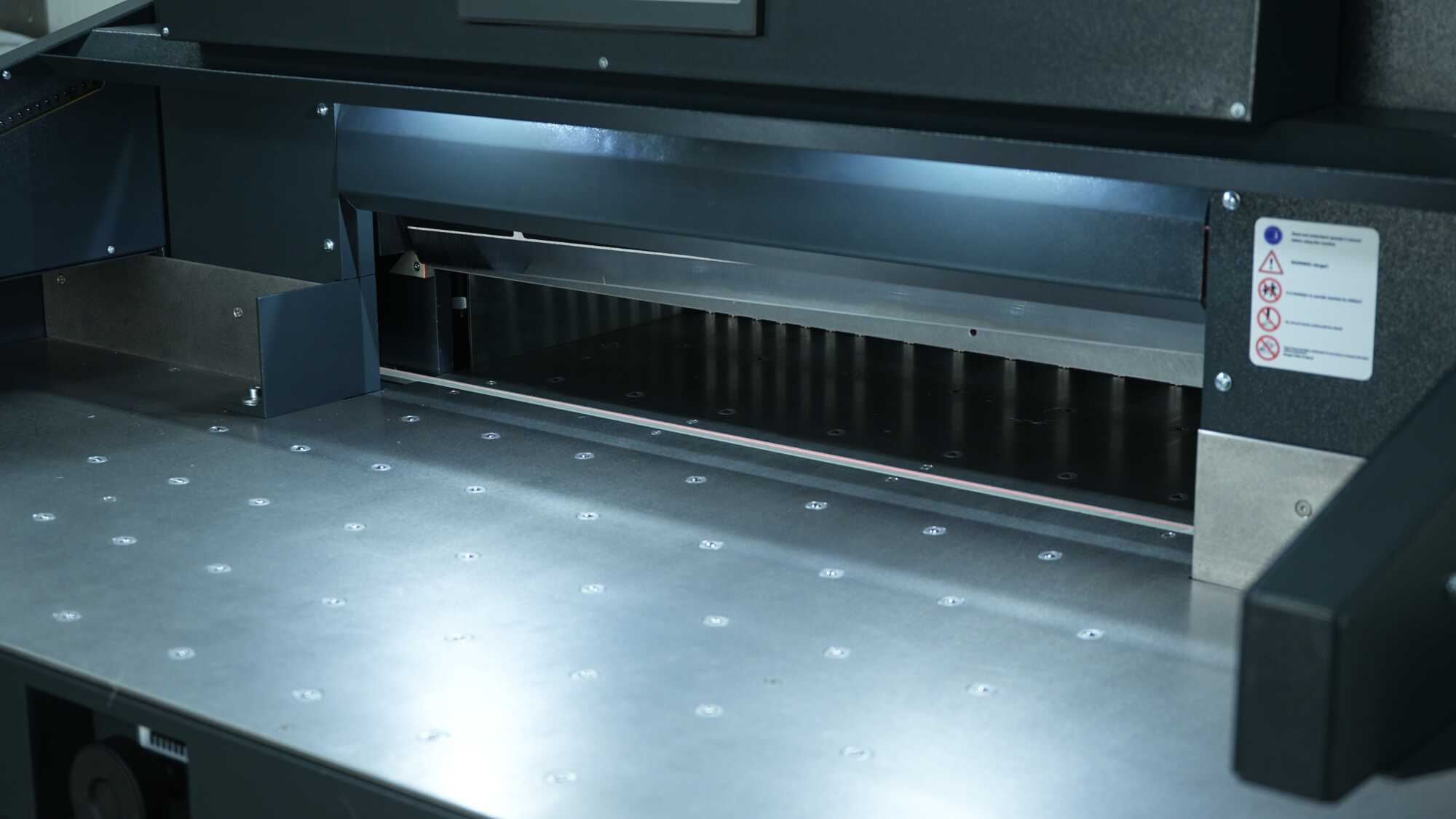 Hydrauliczna krajarka do papieru (nóż + niezależny docisk) z przemysłowym sterownikiem PLC produkowana w Polsce. Szerokość i głębokość cięcia wynosi 80cm.  Krajarka tnie stosy do 10cm. Urządzenie rekomendowane szczególnie jeśli cięte są bardzo różnorodne materiały (siłę docisku można płynnie regulować na ekranie maszyny). Maszynę cechuje dodatkowo wysoka precyzja +- 0,1mm oraz szybki przesuw siodła dzięki zastosowaniu serwomotoru. Do obsługi służy intuicyjny, dotykowy programatora 10″ w jeżyku polskim. Maszyna jest również bezpieczna dzięki zastosowaniu markowych kurtyn bezpieczeństwa oraz komponentów spełniających normy CE. Dzięki możliwości demontażu stołów  maszyna może być zainstalowana przez przejście 80cm w pomieszczeniach z utrudnionym dostępem”.