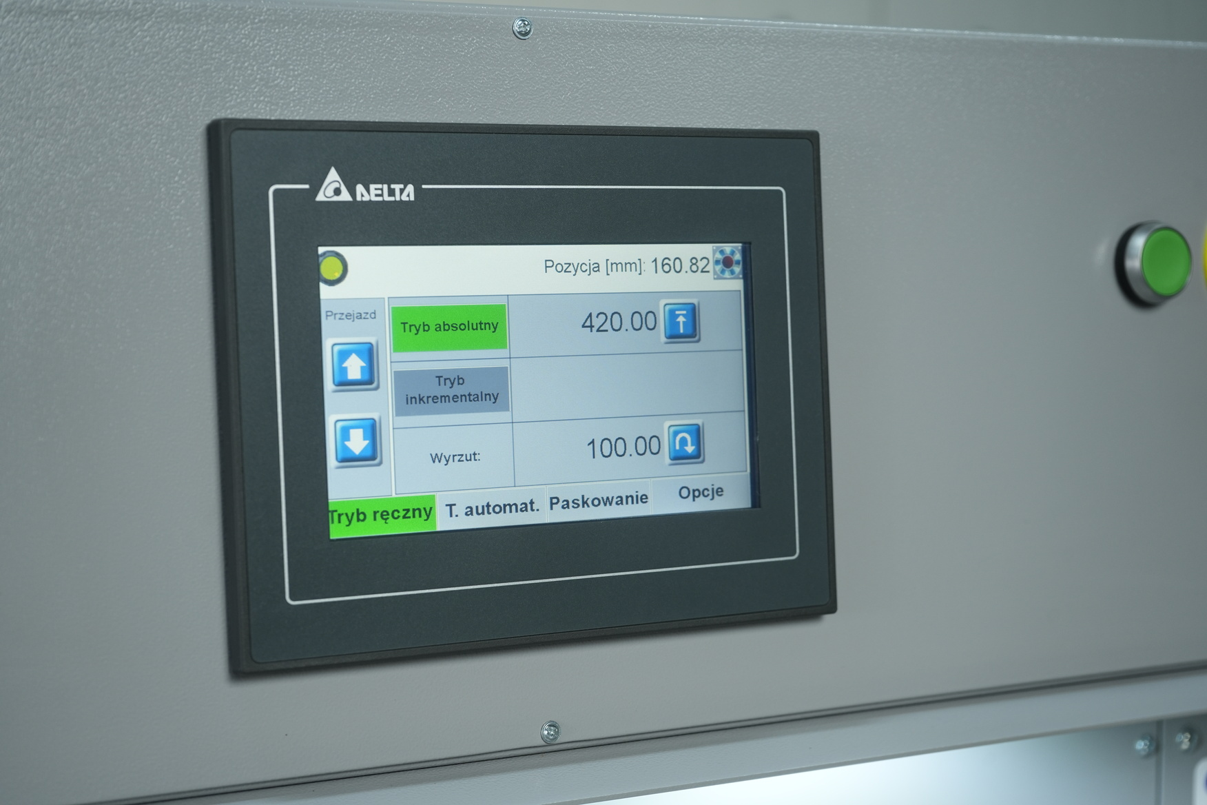 - możliwość zaprogramowania dla każdego z kroków programu wyrzutu, włączenia/wyłączenia nadmuchu oraz wyświetlenia wskazówki dla operatora o kierunku obrotu stosu (przy pracach gdzie docinamy blok z kilku stron)