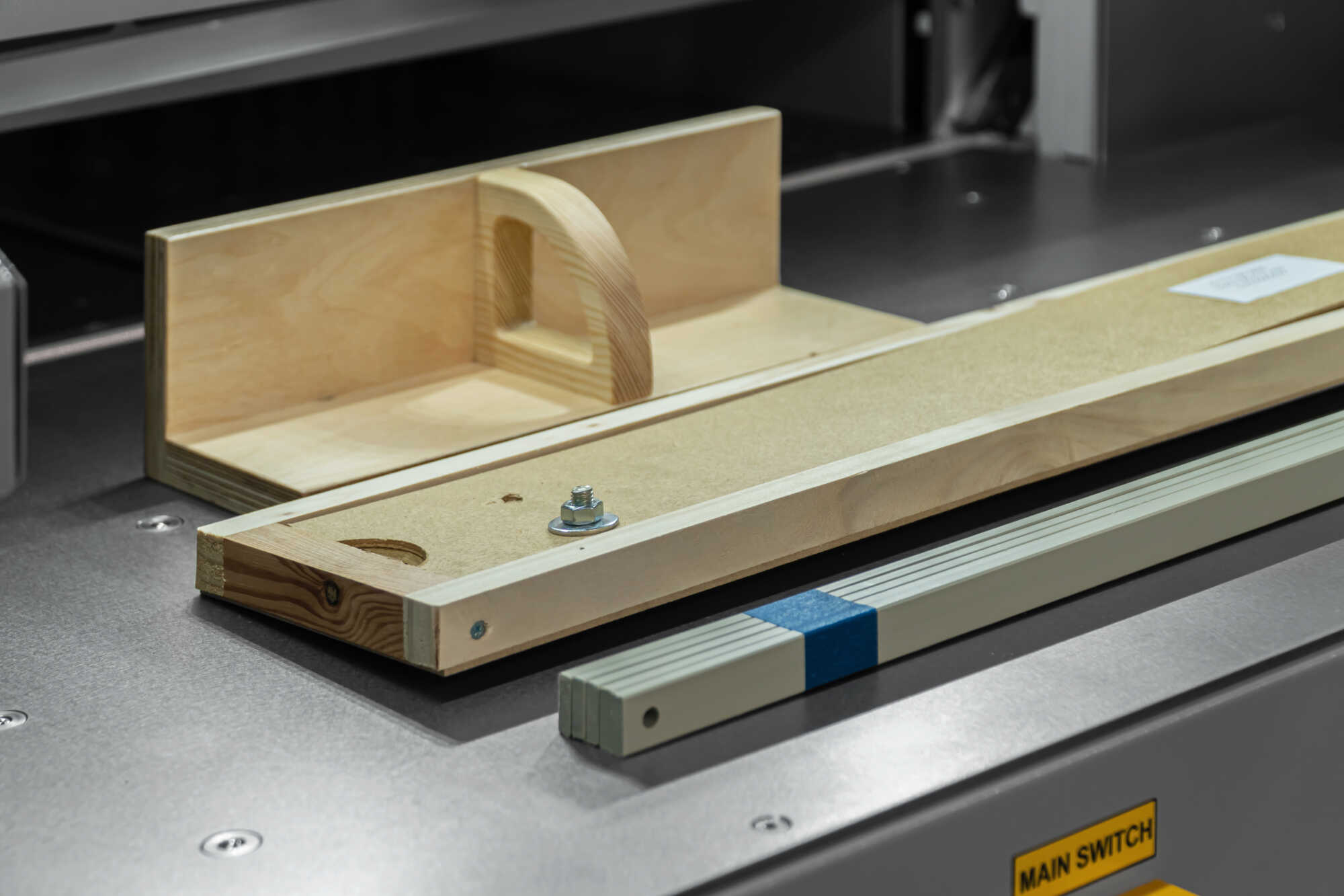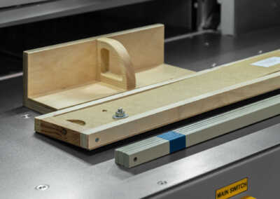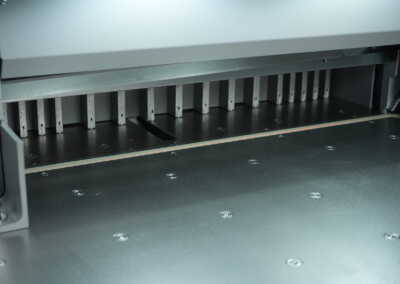 - bezpieczeństwo pracy zapewniają: kurtyny bezpieczeństwa chroniące pole pracy, kontrola zatrzymania noża w górnym punkcie, oburęczne włączanie urządzenia, osłony stołu tylnego, przycisk awaryjnego zatrzymania na przednim panelu, narzędzie wymiany noża zabezpieczające ostrze
