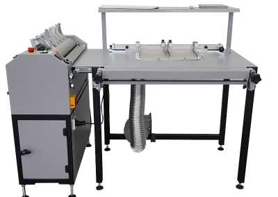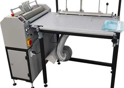 Urządzenie służy do pokrywania cienką warstwą kleju płaszczyzn takich jak: papier, ekoskóra, PVC oraz produkcji typowych okładek w oprawie twardej oraz główek kalendarzowych itp. Składa się z: kaszerówki do nanoszenia kleju na zimno lub na gorąco oraz stołu montażowego do okładek twardych wyposażonego w podsys , pozycjonery oraz moduł z wałkami do zawijania okleiny.