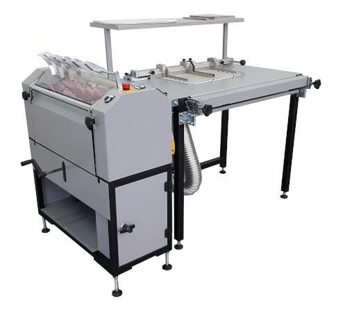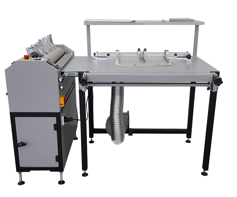 - moduł zawijania okleiny, ręczny, 2 wałki gumowe z listwą oporową od spodu (możliwość zdemontowania dla pełnego przelotu okładki celem jej sprasowania)
