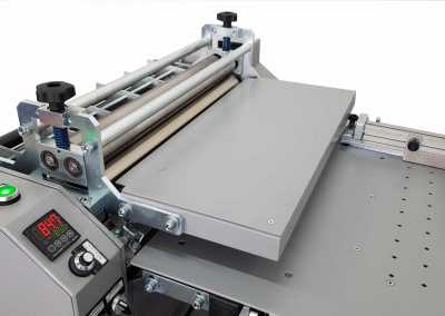 - W wersji standardowej urządzenie jest dedykowane do nakładania kleju na materiał o grubości 80-300 gsm. Opcjonalnie za pomocą modułu do nakładania kleju na sztywne podłoża